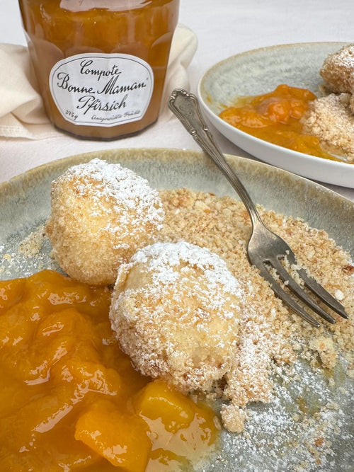 - Knedlíky posypte moučkovým cukrem a podávejte s broskvovým kompotem Bonne Maman.