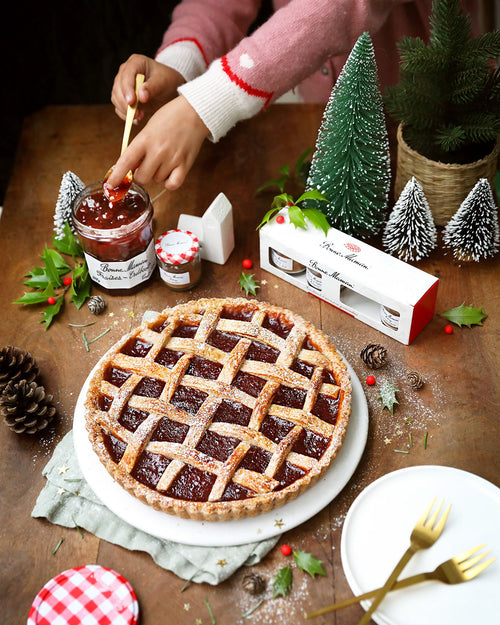 Spodní část těsta propíchejte vidličkou a navrch rozetřete sklenici jahodového džemu Bonne Maman. Druhý kus těsta nakrájejte na proužky široké asi 1 cm. Proužky rozložte do mřížkovaného vzoru, jak je znázorněno ve videu.